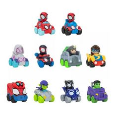 Lot de 10 mini-véhicules Marvel's Spidey And His Amazing Friends - Assortiment de mini-véhicules de 5 cms comprenant Spidey, Ghost Spider, Miles, Hulk et bien d'autres - Des jouets mettant en vedette vos sympathiques voisins Spideys.
