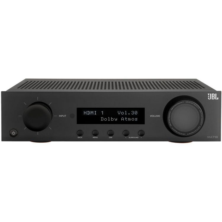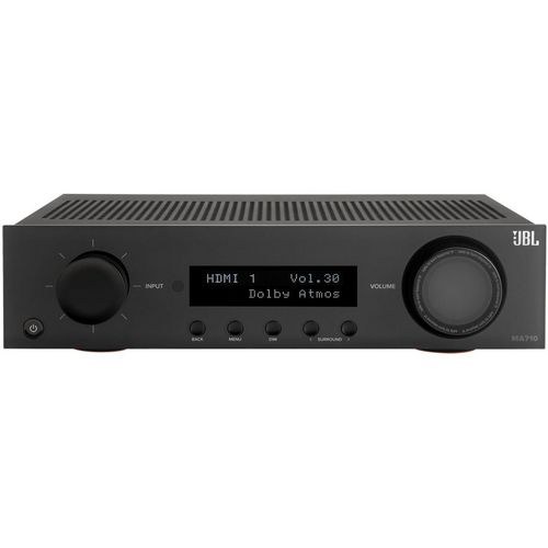 Acheté en remplacement de mon ampli Onkyo qui devenait vieillissant et montrait quelques signes de fatigue, j'ai été attiré d'abord par les dimensions réduites de ce MA710... Si vous avez comme moi un meuble TV avec peu de profondeur, il est parfait ! Ensuite, je possède déjà pas mal de matériel JBL et je sais que la qualité est toujours au rendez-vous donc ce choix était une évidence et je n'en suis vraiment pas déçu ! Une fois raccordé à mes 7 haut-parleurs, je décide de démarrer mon test par le visionnage d'un film en Dolby Atmos et là... Etonnant ! La dynamique est bien au rendez-vous et la qualité audio bien meilleure que mon ancien ampli. Les différents canaux sont exploités à merveille et avec beaucoup de précision sur l'ensemble des fréquences. Deuxième test avec cette fois ci de la musique via Bluetooth et sans surprise, ça sonne bien, même très bien! Tout est très bien détaillé, le grave descend très bas et les notes les plus hautes brillent parfaitement sans jamais être agressives Un pur bonheur de redécouvrir des albums sur cet ampli ! Seul petit défaut, je trouve la télécommande un peu décevante pour ce type de produit, trop épurée à mon gout mais ce n'est que mon avis personnel... Bref, un ampli qui a su me faire oublier rapidement l'ancien !