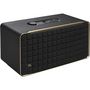 Le design de ce produit est sobre et peut s’intégrer parfaitement dans un salon ou dans n’importe quelle pièce grâce à son liseré doré qui lui donne un côté rétro et moderne à la fois. Il amène également une touche élégante et fait de ce produit une enceinte unique. La mousse de protection avant est solide et conforte dans l’idée que cette enceinte est robuste. Les boutons situés sur le dessus sont de très bonne facture et ne dénaturent pas l’ensemble du design. L’éclairage LED indiquant le niveau du volume, des basses et des aigus permettent de savoir en un clin d’oeil les réglages effectués. À l’arrière, une entrée RJ45 permet de la relier au réseau du domicile afin de faire du multiroom. Une prise auxiliaire jack 3.5mm pour relier d’autres appareils (ex: tourne-disque), une prise USB-C et l’alimentation. La prise en main de cette enceinte est très simple et intuitive. Grâce à sa configuration, l’utilisation quotidienne est rapide et sans prise de tête. Pour contrôler l’ensemble des fonctionnalités de l’enceinte, il faut utiliser l’application JBL One. Il est aussi bien possible de régler les graves et les aigus depuis les boutons physiques dédiés que depuis l’application qui intègre un égaliseur à trois bandes. Elle permet aussi de configurer les assistants vocaux Alexa et Google Assistant qui peuvent être utilisés selon notre envie, ce qui est un plus! Depuis l’application, on peut également configurer un « moment ». En appuyant sur la touche avec un cœur située sur l’enceinte, on peut lancer une playlist choisie en amont, sa durée de diffusion ainsi que le niveau de volume. Le seul bémol est le nombre de services proposés qui est limité. Ce sont essentiellement des plateformes de musique haute qualité mais malheureusement Spotify n’en fait pas partie. Peut-être plus tard? La qualité audio est excellente. Si vous aimez écouter la musique avec des basses un peu poussées, cette enceinte est faite pour vous!Heureusement qu’il est quand même possible de régler la ligne de basses et d’aigus grâce aux boutons physiques ou via l’application qui rend le réglage plus facile. La restitution sonore depuis un tourne-disque via la prise jack n’est malheureusement pas très réaliste. Cependant, la restitution en configuration Home Cinema nous plonge dans une immersion juste parfaite. En somme, cette enceinte est le parfait compromis pour une enceinte de salon modulaire.