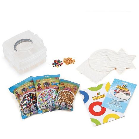 - Plus de 7000 perles Hama Midi de 30 couleurs différentes - Découvrez 3 grandes plaques (ronde, carrée et étoile) ainsi que 2 trieurs de perles pour vous aider à répartir les couleurs et tout ranger facilement. - Retrouvez également 1 livre d’inspiration avec 8 modèles rigolos à reproduire Sont inclus : des instructions et 1 feuille de papier à repasser.