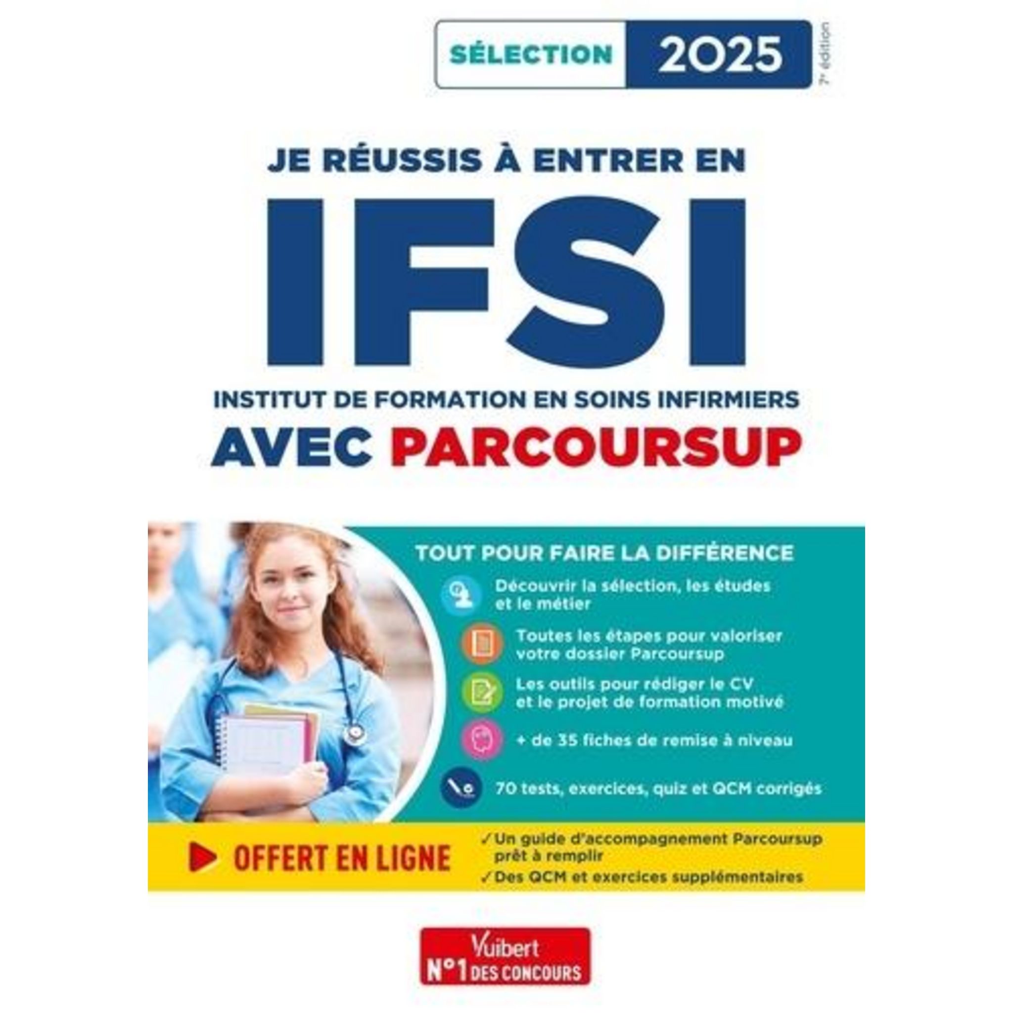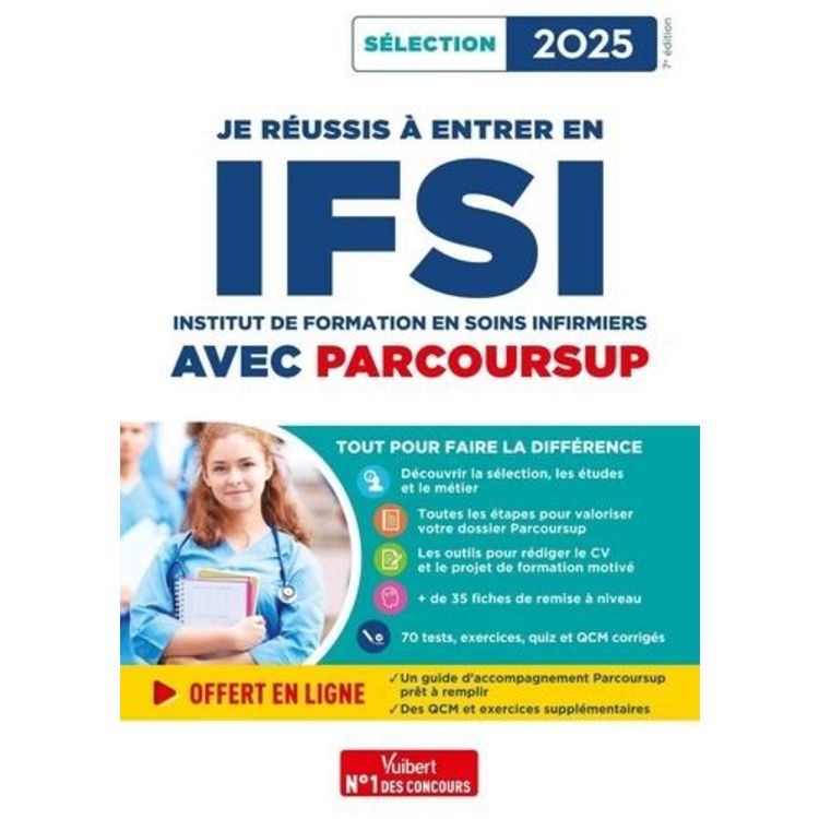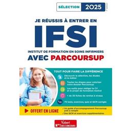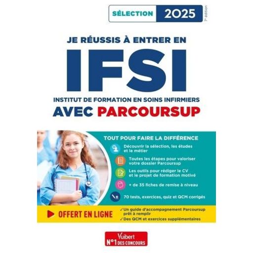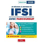 Un livre complet. Tout savoir sur la sélection, les études et la profession : Contenu de la formation, évaluation , Missions, lieux d'exercice, carrière , 10 qualités essentielles , Témoignages de professionnels , Quiz sur les études et le métier. Réussir son dossier Parcoursup et valoriser sa candidature : Calendrier et étapes-clés des inscriptions, voeux, dossier , Conseils et stratégies pour élaborer son projet professionnel , Outils et exemples pour rédiger son projet de formation motivé, son CV et sa lettre de motivation. Se remettre à niveau : Les connaissances indispensables sur les enjeux sanitaires et sociaux, les aptitudes mathématiques et logico- déductives, la biologie et l'anglais , Les conseils pour améliorer ses compétences en communication écrite et orale , 70 tests, exercices, quiz et QCM corrigés pour s'auto-évaluer et s'entraîner. Offert en ligne : Un guide d'accompagnement Parcoursup prêt à remplir, des QCM et exercices supplémentaires. Des auteurs spécialistes de la sélection, formateurs, au plus près des réalités des études en soins infirmiers.