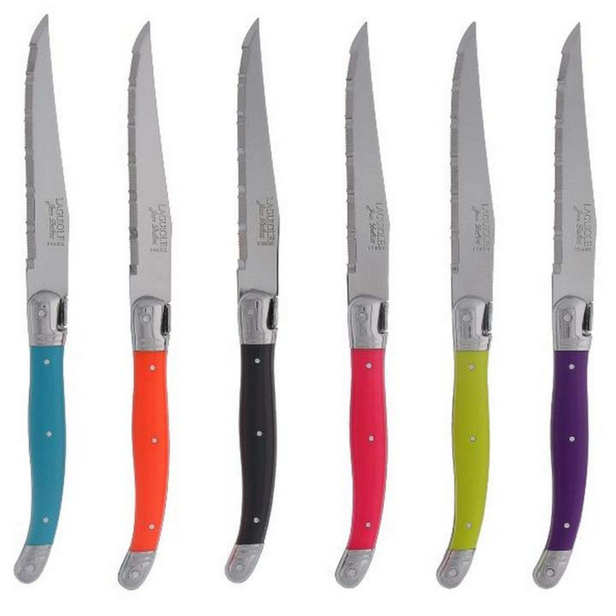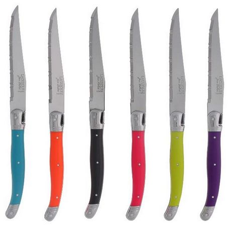 En savoir +Jean Dubost LOO60011TON Coffret de 6 couteaux à steak Laguiole Tonic Mix LOO60011TON de Jean Dubost. Des couverts aux coloris acidulés assortis pour égayer votre table en y apportant une touche de couleur ! Lame inox pleine soie micro-dentée d'épaisseur de 1.2 mm. Coupe rasoir sans affûtage. Manche en plastique ABS de couleur. Nettoyage facile : passe au lave-vaisselle. Livré dans un coffret en bois naturel.
