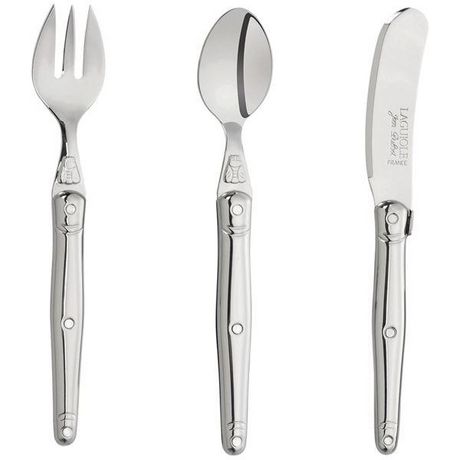 Set 3 couverts enfant. Laguiole Inox. Avec ce set de couverts Laguiole, votre enfant aura lui aussi ses couverts Laguiole mais adaptés à la taille de sa bouche et de ses petites mains, pour faire comme les grands! Comprend une cuillère, un couteau lame ronde et une fourchette de taille et de forme adaptées. 100 % inox.