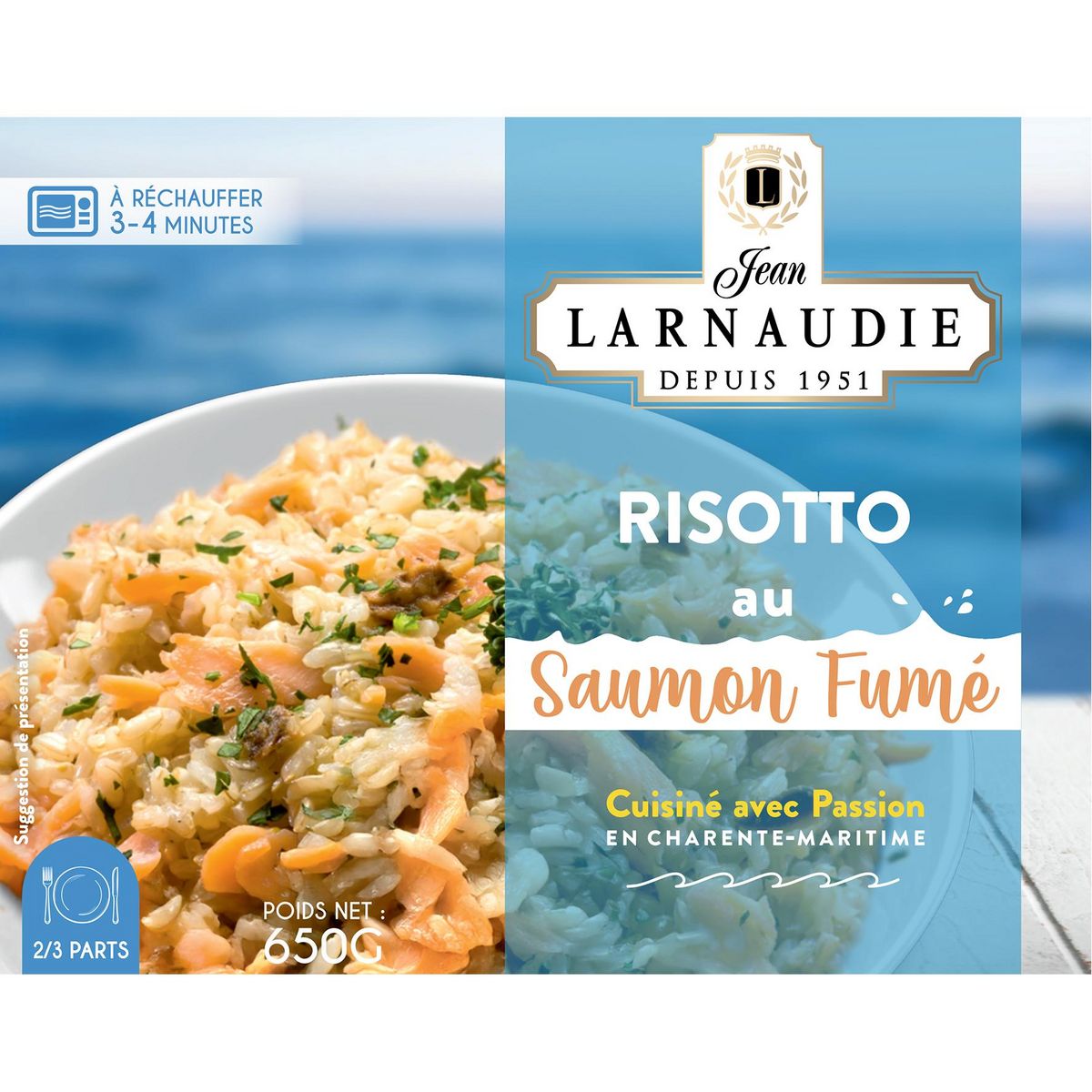 Ingrédients : Eau, riz 19,8%, crème 13,58% (LAIT) (dont stabilisant : carraghénanes), saumon fumé 12% (Saumon (Salmo salar), sel de l'île de ré) (POISSON), huile de tournesol, vin blanc (SULFITES), oignon, parmesan (LAIT), fond de volaille (maltodextrine, dextrose, sel, graisse de poule, arôme, aromates, poudre de poule), champignons, liant (amidon modifié, sel, épaississant : E415, dextrose, acidifiants : E330, E334, huile de tournesol oléique - auxiliaire technologique; antiagglomérant : carbonate de magnésium - E 504i), persil, poivre blanc.