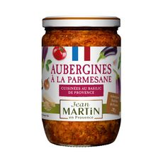 Aubergines 45%, tomates 30%, huile de tournesol, oignons 7%, concentré de tomates, basilic 2%, fromage râpé, sel, parmesan AOP Parmigiano reggiano 0,5% (lait, sel, présure), ail, sarriette, poivre.