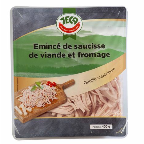 Emincé de saucisse de viande 87,5% (viande de porc* 79%, eau, gras de porc*, sel iodé (sel, iodure de potassium), dextrose, épices, arômes, stabilisant : E450, antioxydant : E300, conservateur : E250), FROMAGE Emmental 12,5% (45%de matières grasses). *Origine UE
