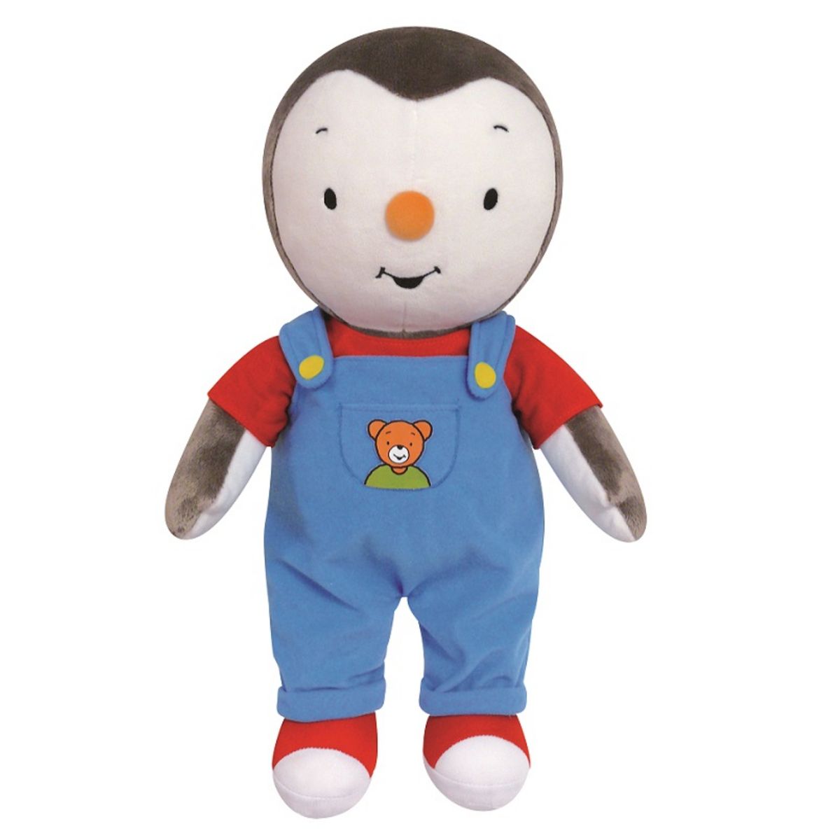T'CHOUPI est une peluche douce de 45cm vêtu d’une salopette bleue imprimée doudou et d’un tee-shirt rouge.