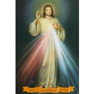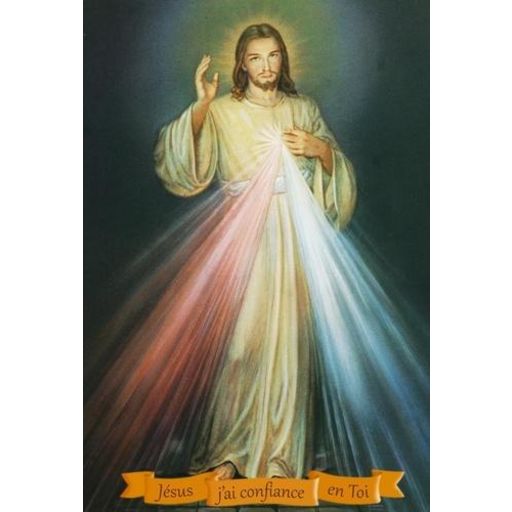 Texte au verso : la prière du chapelet de miséricorde divine (on récite les prières suivantes sur un chapelet ordinaire) Au début : Notre Père..., Je Vous salue Marie..., Je crois en Dieu... Sur les gros grains, une fois : Père Eternel, je Vous offre le Corps et le Sang, l'Ame et la Divinité de Votre Fils bien-aimé, notre Seigneur Jésus-Christ, en réparation de nos péchés et de ceux du monde entier. Sur les petits grains, 10 fois : Par Sa douloureuse Passion, Soyez miséricordieux pour nous et pour le monde entier. Pour terminer, 3 fois : Dieu Saint, Dieu Fort, Dieu Eternel, Ayez pitié de nous et du monde entier.