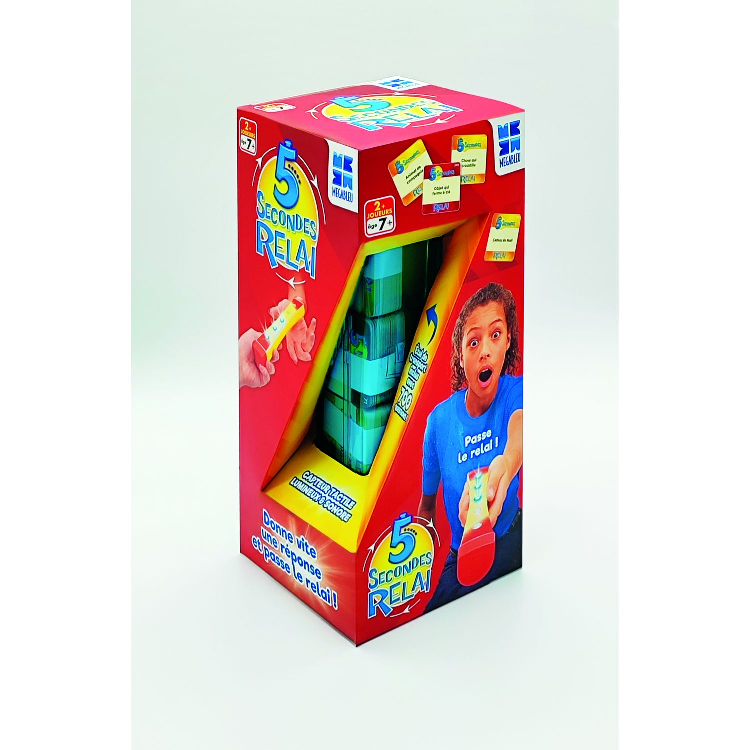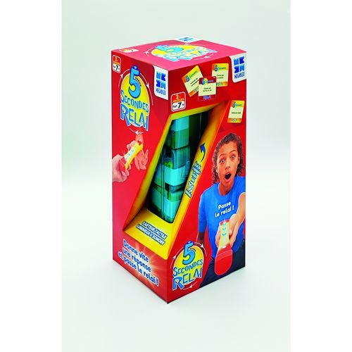 La version « relai » du jeu 5 SECONDES !Avant de commencer la partie, chaque joueur reçoit un nombre identique de cartes-vie.Un joueur lit ensuite à voix haute le thème de la carte.Exemple : « Un fromage », « un acteur français ». Le joueur qui tient le chronomètre a alors 5 secondes pour donner sa réponse et passer le relai au joueur de son choix (il n’ y a pas d’ordre de défini, un même joueur peut se voir passer le relai plusieurs fois de suite !).Dès que ce joueur prend en main l’extrémité du relai, le chrono repart pour 5 secondes.Il doit alors vite donner une nouvelle réponse. Si un joueur ne parvient pas à trouver de réponse à temps, les lumières deviennent rouges et il perd une carte-vie. Le gagnant est le dernier joueur à détenir une carte-vie.