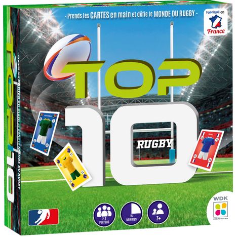 Top 10 rugby : prends tes cartes en main et défie le monde du rugby ! Chaque joueur choisit une équipe parmi les 10 pays. Le premier qui se débarrasse de ses cartes gagne un match. Jouez la même équipe, la même couleur ou le même numéro. Collectez vos joueurs et utilisez les cartes spéciales. Le gagnant est celui qui remporte 3 matchs. 2-5 joueurs. Dès 7 ans.