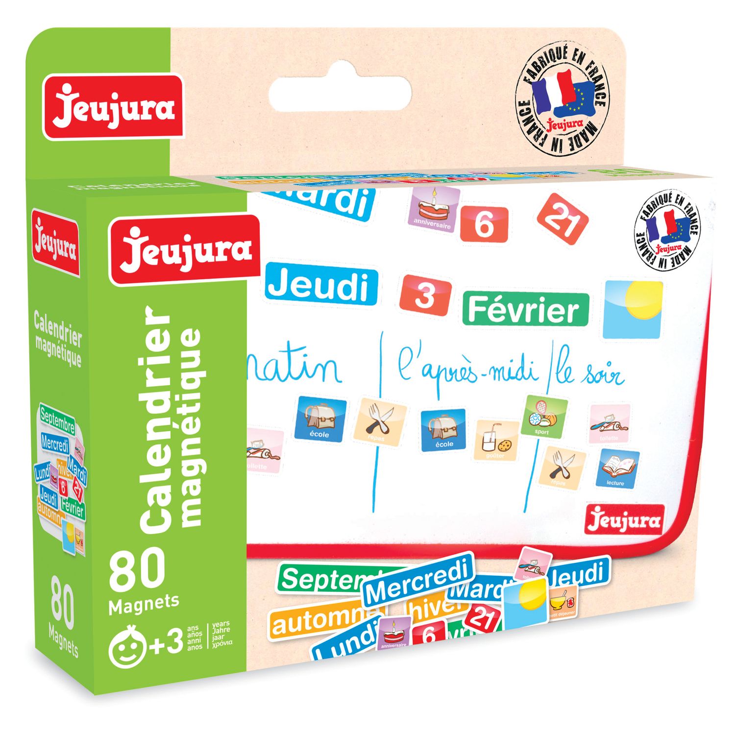 - Plus 80 magnets aimantés représentant jours, mois, chiffres, saisons, temps...