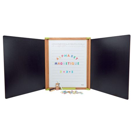 Profitez d'un grand espace pour dessiner sur ce tableau mural en bois à trois volets !Votre enfant pourra cacher ses dessins car le triptyque ce replie pour gagner de l'espace.- une ardoise centrale magnétique sérigraphiée- deux volets avec une face pour la craie et une face pour feutre effaçable à