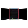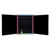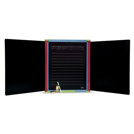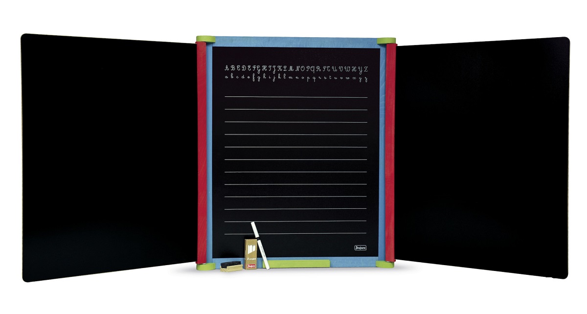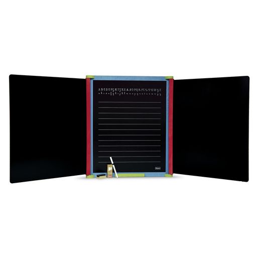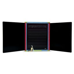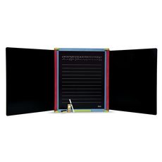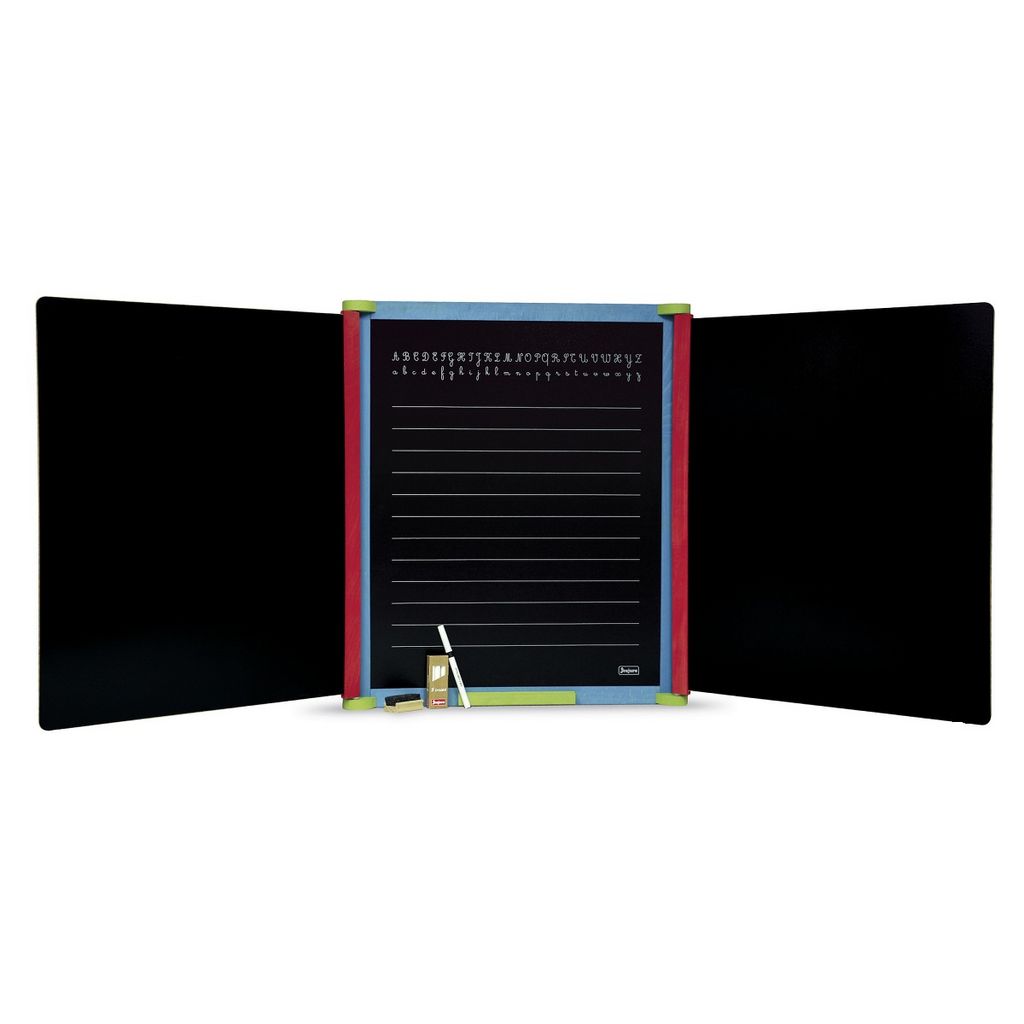 - Grand Tableau Triptyque Mural trois volets en bois : une ardoise centrale sérigraphiée pour la craie et deux volets avec une face pour la craie et une face pour feutre effaçable à sec