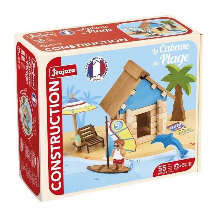 La Cabane de Plage 55 Pieces - JEUJURA - Jeu de Construction en Bois Naturel, Tapis et Accessoires Inclus, 22x18,5x8,5 cm