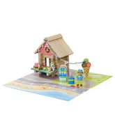 Un jeu de construction en bois naturel et teinté avec une notice de montage, un tapis de jeu et de nombreux accessoires.