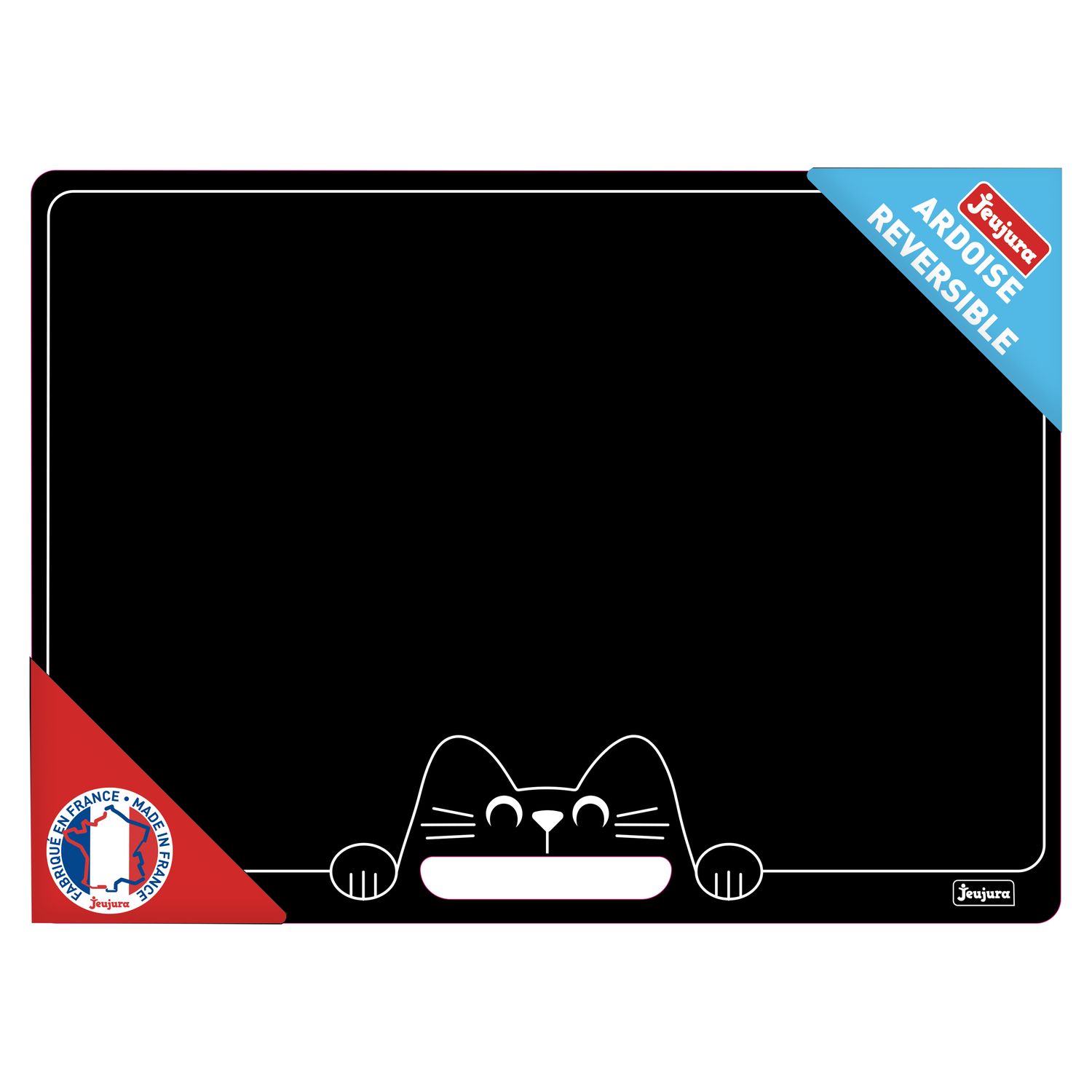 L'Ardoise Réversible CHAT est à transporter partout grâce à sa poignée. Une face noire pour écrire à la craie et une face blanche pour feutre effaçable à sec.