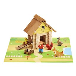 Ma Ferme en Bois - 60 pièces : jeu de construction en bois naturel et teinté avec une notice de montage, un tapis de jeu et de nombreux accessoires et animaux. Coffret carton : 22 x 18,5 x 8,5 cm - A partir de 5 ans
