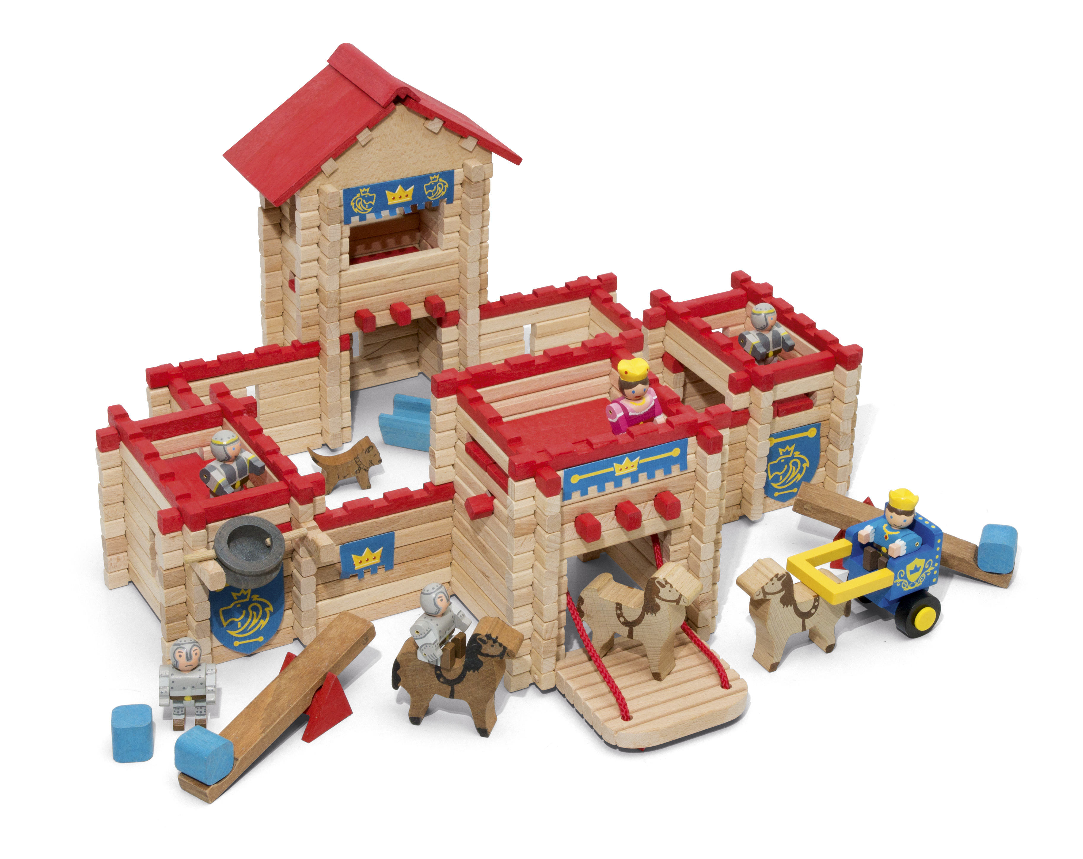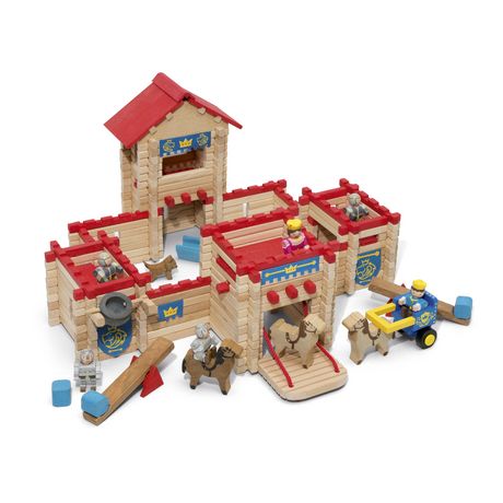 Avec ce jeu de construction Mon Château fort en bois naturel et teinté de chez Jeujura, construis ton propre château fort et amuse-toi avec tes figurines médiévales en bois !