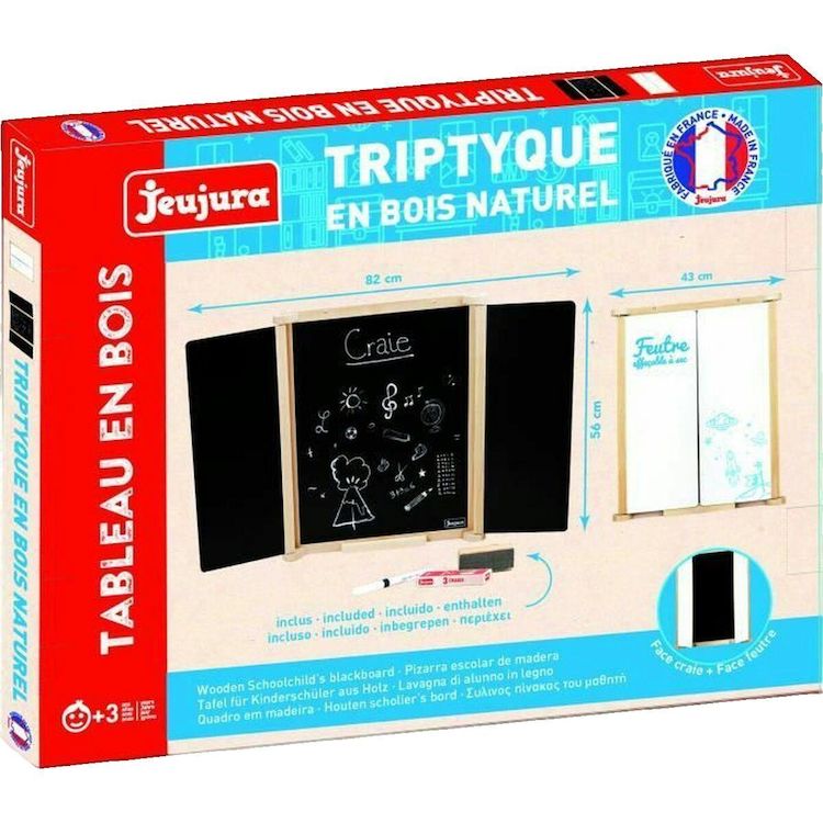 Le tableau éducatif en bois Jeujura naturel est conçu pour stimuler la créativité et l'apprentissage des enfants dès 3 ans. Il comprend une ardoise centrale pour écrire à la craie, ainsi que deux volets pour dessiner. Fabriqué en bois naturel robuste, il assure durabilité et élégance. L'ensemble est livré avec trois craies, un feutre effaçable et une brosse pour faciliter l'apprentissage ludique. Compact et facile à ranger, il convient parfaitement aux chambres d'enfants ou aux espaces pédagogiques à la maison ou à l'école. Dimensions fermées : 43 x 56 cm, dimensions ouvertes : 82 x 56 cm, poids : 2.6 kg.