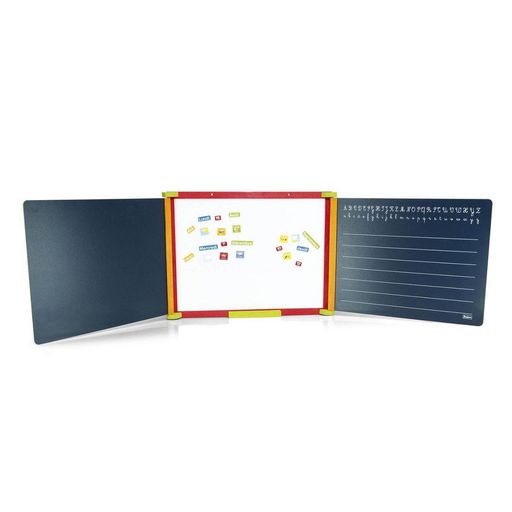 Tableau triptyque mural trois volets en bois : une ardoise centrale magnétique pour feutre effaçable à sec, deux volets avec une face pour la craie et une face pour feutre effaçable à sec.