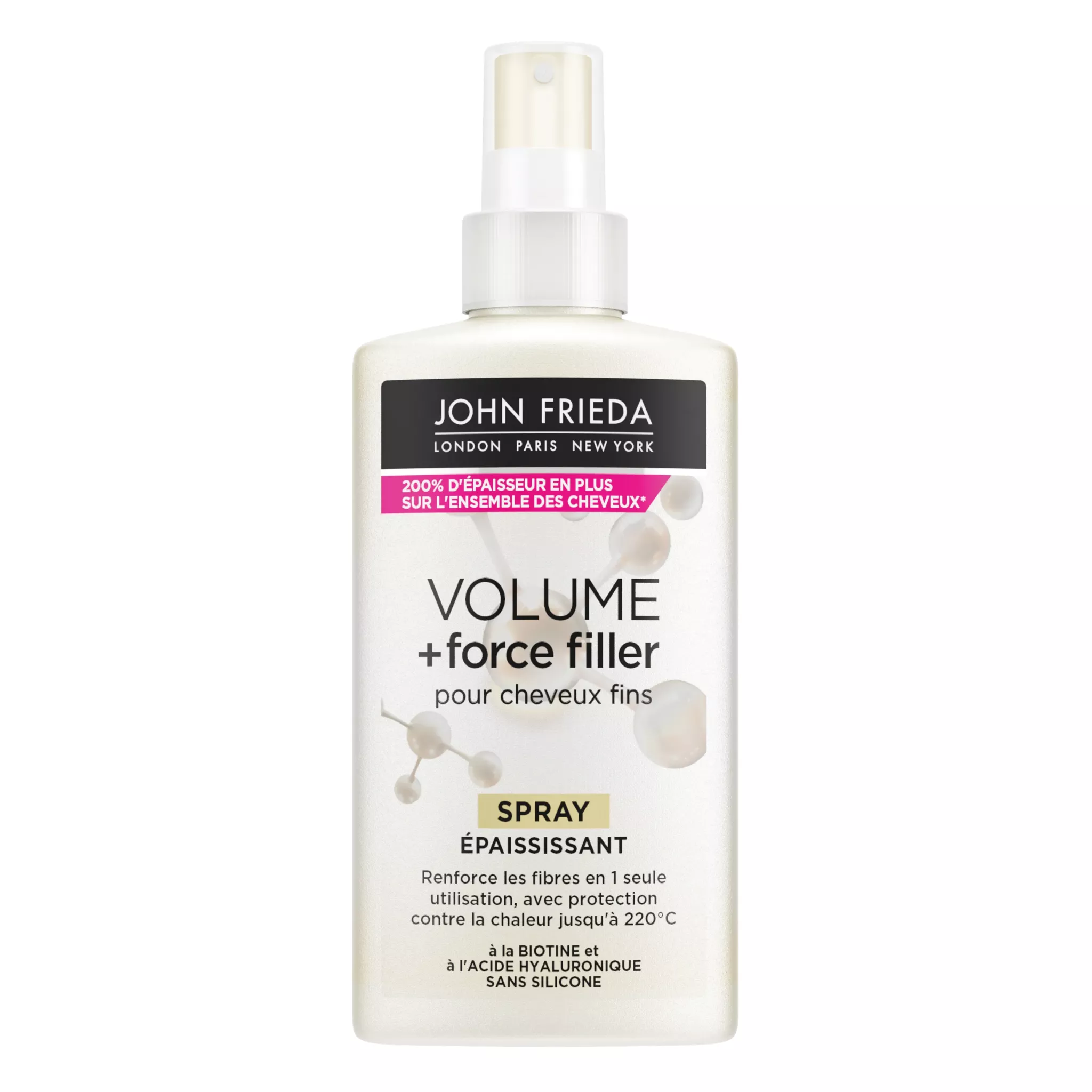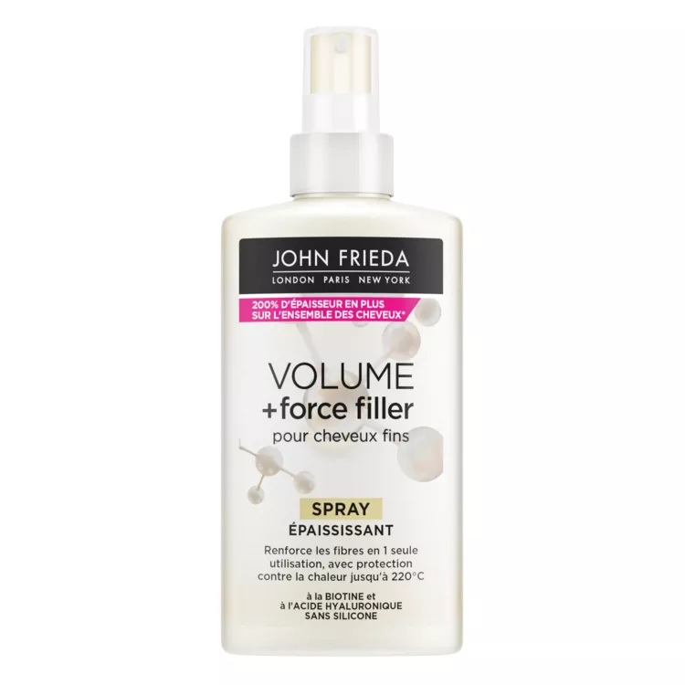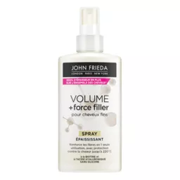 Obtenez instantanément des cheveux plus épais avec plus de corps. Infusé à la biotine et à l'acide hyaluronique, ce spray épaissit visiblement les cheveux tout en les protégeant de la chaleur. Il sont ainsi prêts à être coiffés. RÉSULTATS DES TESTS CLINIQUES : 200 % d'épaisseur en plus sur l'ensemble de la chevelure* Réduit la chute de cheveux due à la casse* Des cheveux plus forts et moins cassants* Protection contre la chaleur jusqu'à 220°C *Quand on utilise le shampooing, le soin démêlant et le spray Volume + Force Filler pour cheveux fins versus un shampooing classique.