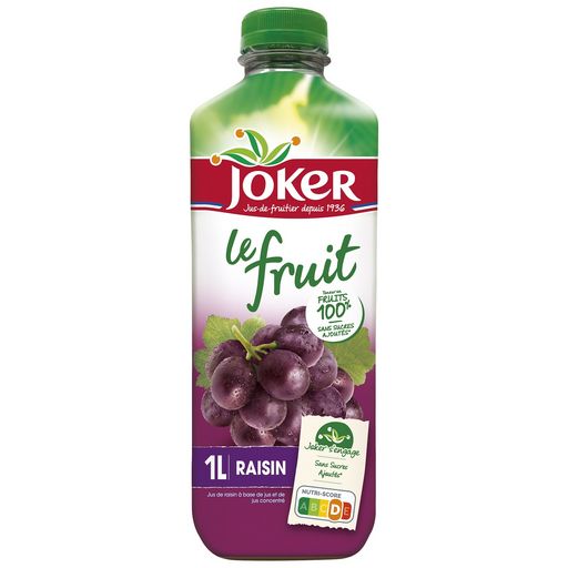 JOKER s'engage avec ce jus de fruits 100% teneur en fruits, sans conservateurs*, sans colorants* et sans sucres ajoutés*. Un jus idéal pour votre petit déjeuner ! Composé simplement du sucre naturel des fruits*, ce jus est majoritairement Nutri-Score C, comme la moyenne des jus et nectars. *Comme tous les jus de fruits. Contient les sucres naturellement présents dans les fruits. Jus de raisin à base de jus et de jus concentré.