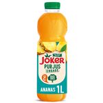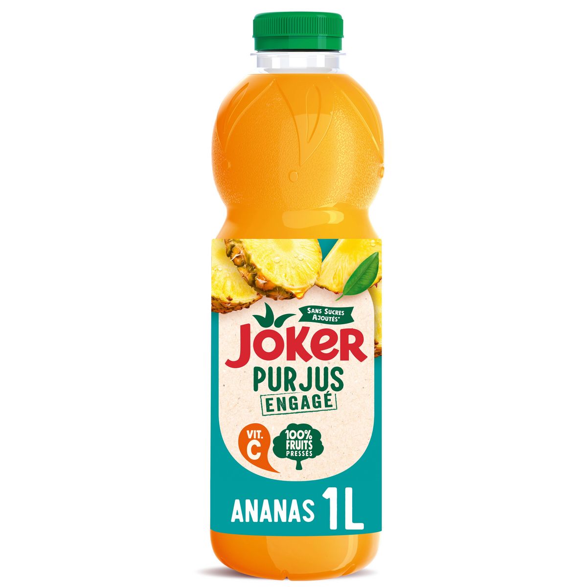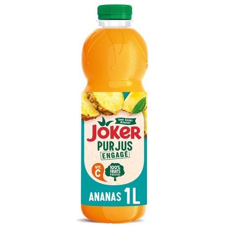 Jus d’ananas source de vitamines C et B9 JOKER s'engage avec ce délicieux jus de fruits sans conservateurs*, sans colorants*, sans sucres ajoutés*. Avec 100% de pur jus de fruits pressés et simplement le sucre naturel des fruits*, notre gamme est Nutri-Score C, comme la moyenne des jus et nectars. Idéal pour le petit déjeuner en famille ! Nos emballages sont 100% recyclables et intègrent déjà 25% de plastique recyclé (r-PET) ! *Comme tous les jus de fruits. Contient les sucres naturellement présents dans les fruits.