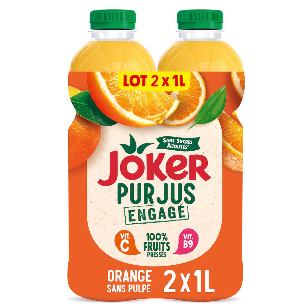 Découvrez la gamme Joker Pur Jus Engagé, le plaisir d'un jus 100% fruits pressés. Fabriqué en France à Mâcon, sans sucres ajoutés*, sans colorants* et sans conservateurs*. De délicieux jus de fruits et légume issus d'une culture plus durable(1).