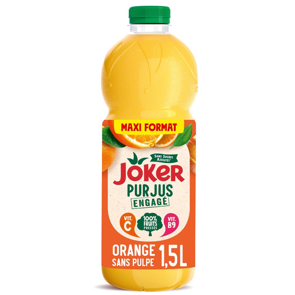 Découvrez la gamme Joker Pur Jus Engagé, le plaisir d'un jus 100% fruits pressés. Fabriqué en France à Mâcon, sans sucres ajoutés*, sans colorants* et sans conservateurs*.