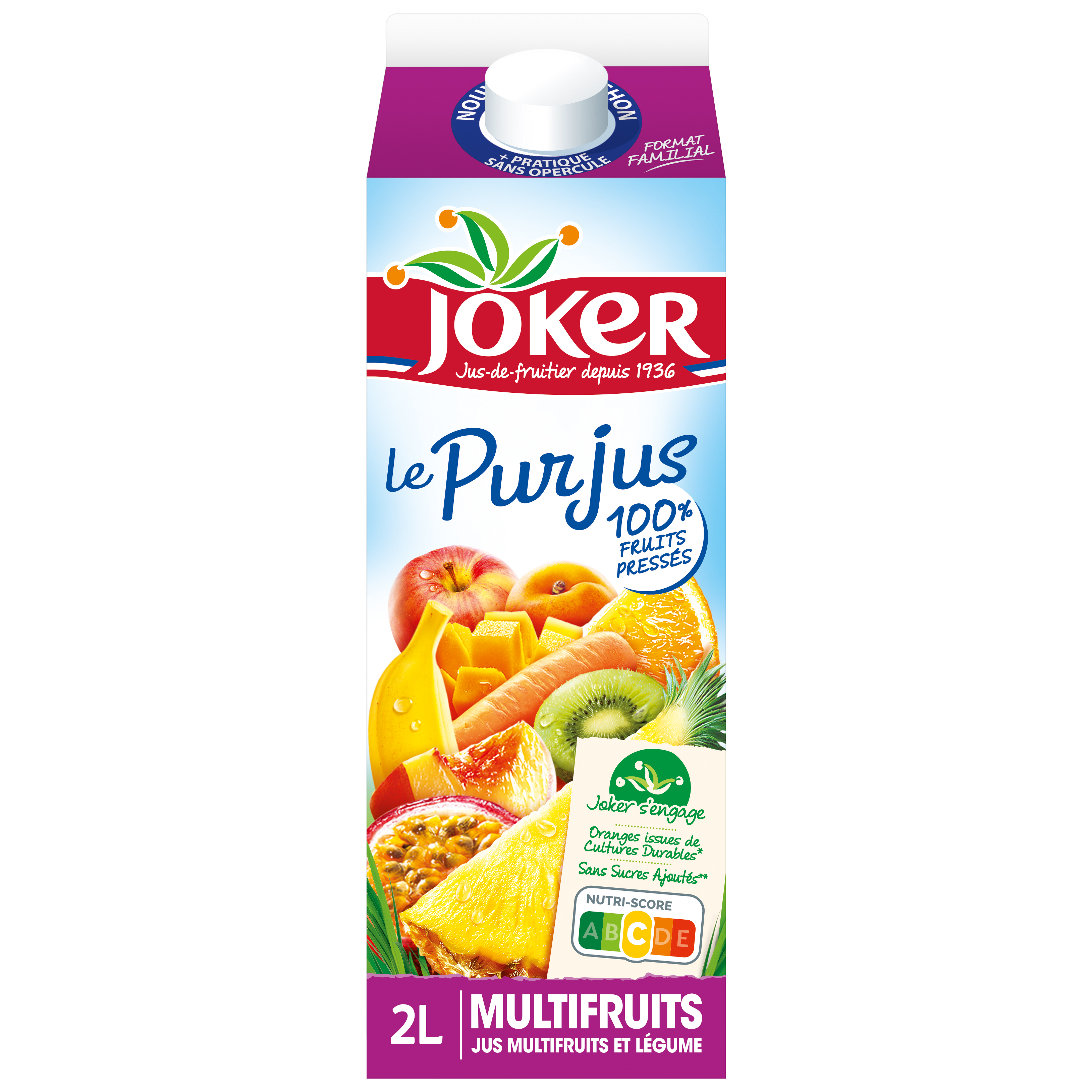 JOKER s'engage avec ce délicieux jus de fruits sans conservateurs*, sans colorants*, sans sucres ajoutés*. Avec 100% de pur jus de fruits pressés et simplement le sucre naturel des fruits*, notre gamme est Nutri-Score C, comme la moyenne des jus et nectars. Idéal pour le petit déjeuner en famille ! Nos emballages sont 100% recyclables et intègrent déjà 25% de plastique recyclé (r-PET) ! *Comme tous les jus de fruits. Contient les sucres naturellement présents dans les fruits. Jus multifruits et légume.