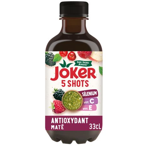 Joker 5 SHOTS Antioxydant, mélange au goût intense: maté, acérola, mûre, framboise, riche en vitamines et minéraux. Une bouteille 5 SHOTS contient les vitamines C, E et le sélénium qui contribueront à protéger les cellules contre le stress oxydatif