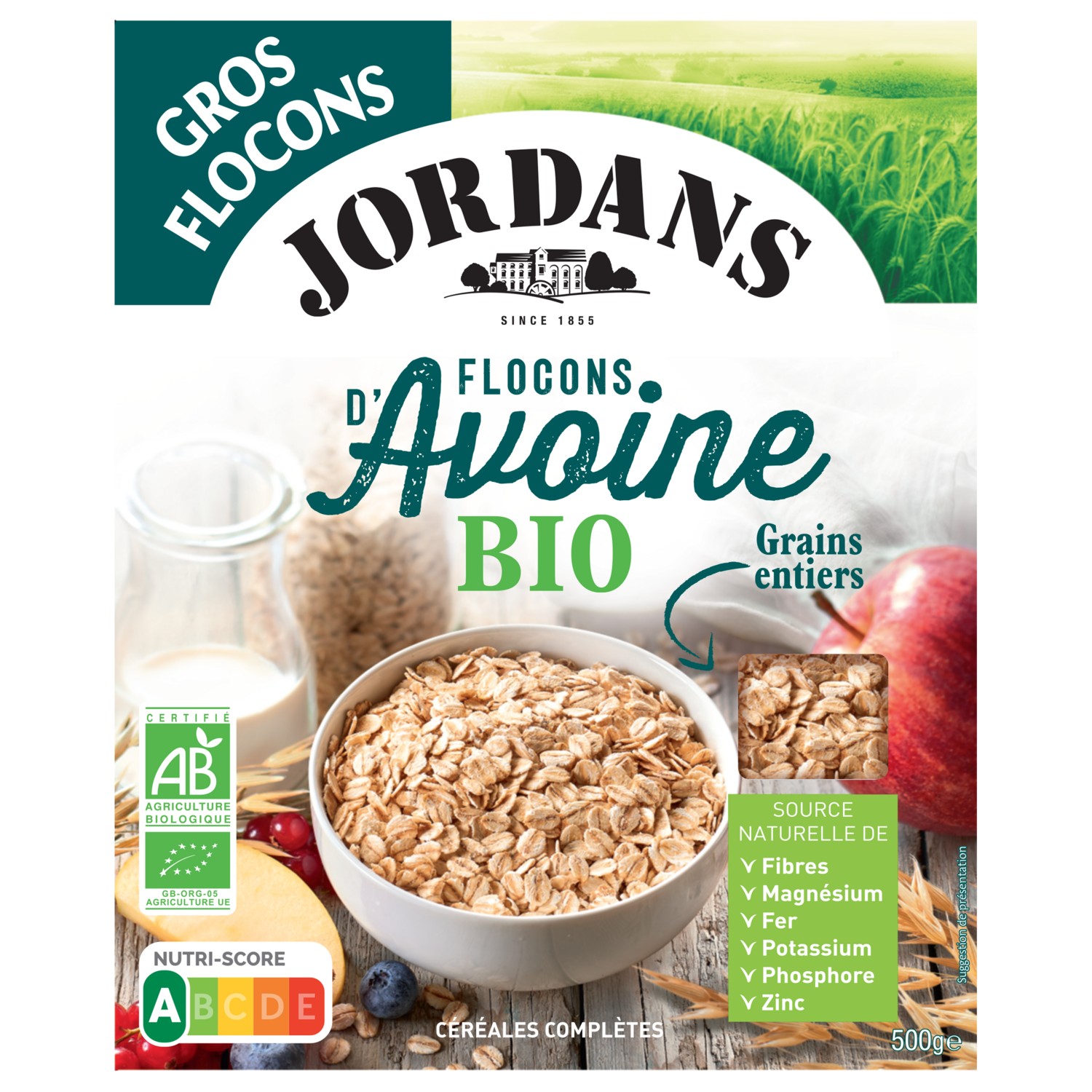 De savoureux flocons d'avoine en grains entiers, issus de l'agriculture biologique ! Les Flocons d'Avoine BIO Jordans sont une variété spécifique ; de gros grains entiers, appelés Jumbo oats, qui vous surprendront par leur saveur subtile et leur text