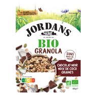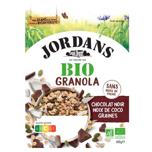 Jordans expert du Granola depuis 1972 vous offre une recette savoureuse, saine et BIO ! Cette recette traditionnelle est constituée de flocons d'avoine dorés au four avec une pointe de miel, associés à de délicieux copeaux de chocolat, noix de coco et graines de courge. Sans huile de palme, ce granola est une source naturelle de nutriments (fibres, magnésium, fer, phosphore, potassium et zinc) !