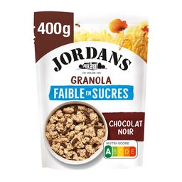 Jordans expert du Granola depuis 1972 vous offre une recette inédite et savoureuse à faible teneur en sucres ! Cette recette traditionnelle est constituée de flocons d'avoine complète et d’orge grillés associés de délicieux copeaux de chocolat noir. Sans colorant, conservateur ni arôme artificiel, ce granola est une source naturelle de nutriments (fibres, fer, magnésium, phosphore et zinc ) !