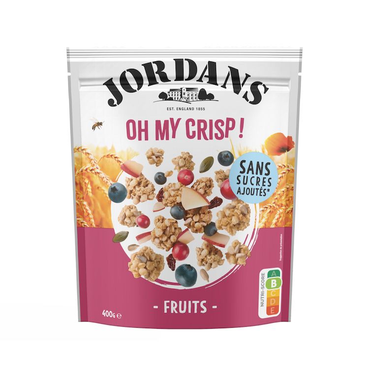 Oh my Crisp! Fruits : de grosses pépites croustillantes d'avoine soufflée et d'avoine grillée associées à un savoureux mélange de pommes, baies et raisins ! Une recette naturellement délicieuse, sans sucres ajoutés et comme toujours chez Jordans, sans colorants, conservateurs, arômes artificiels ni huile de palme.
