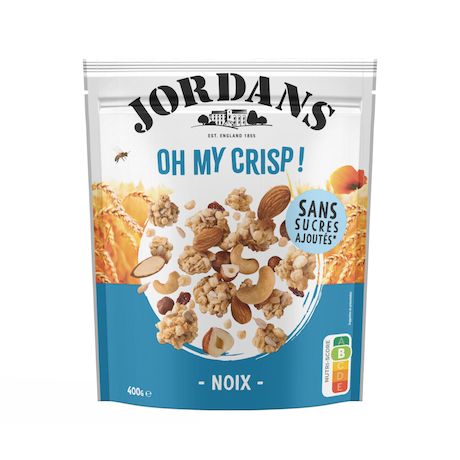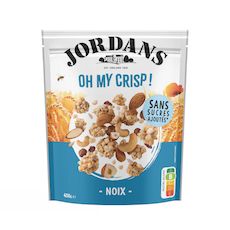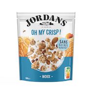 Oh my Crisp! Noix : de grosses pépites croustillantes d'avoine soufflée et d'avoine grillée associées à un savoureux mélange d'amandes, noisettes, noix de cajou et raisins ! Une recette naturellement délicieuse, sans sucres ajoutés et comme toujours chez Jordans, sans colorants, conservateurs, arômes artificiels ni huile de palme.