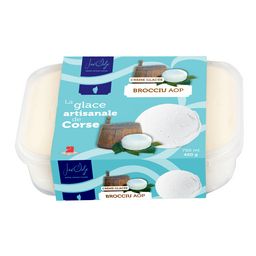 Ingrédients: BROCCIU AOP 35% (LACTOSERUM pasteurisé de brebis et/ou de chèvre corse, LAIT cru de brebis corse, sel), eau, sucre, CREME FRAICHE, sirop de glucose déshydraté, LACTOSE et protéines de LAIT, dextrose, système stabilisant et émulsifiant : mono et diglycérides d'acides gras , farine de caroube, gomme guar, carraghénanes, sel.