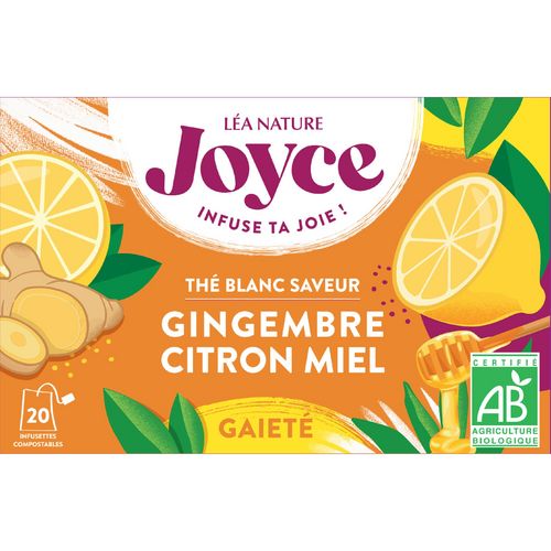 Parce que le bonheur est une collection de petits moments de joie qui donnent le sourire et s'additionnent pour rendre la vie plus belle, nous avons créé JOYCE, une gamme ultra-gourmande qui permettra d'infuser de la joie dans ton quotidien ! Un thé blanc délicat associé à la saveur acidulée du CITRON, au goût épicé du GINGEMBRE, et adouci par une touche de MIEL, qui t'incitera à commencer ta journée avec GAIETE. Arômes naturels de citron et de miel, Extrait de gingembre bio, Fabriqué en France, Infusette compostable, Étui et sachet entièrement recyclables, 1% FOR THE PLANET Bio, 20 sachets