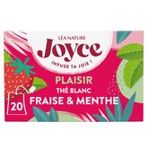 Parce que le bonheur est une collection de petits moments de joie qui donnent le sourire et s'additionnent pour rendre la vie plus belle, nous avons créé JOYCE, une gamme ultra-gourmande qui permettra d'infuser de la joie dans ton quotidien ! Un thé blanc à la douce saveur estivale de FRAISE relevée d'une légère note de MENTHE qui va vous faire rougir de PLAISIR Arômes naturels de fraise et de menthe bio Fabriqué en France Infusette compostable Étui et sachet entièrement recyclables 1% FOR THE PLANET Bio 20 sachets