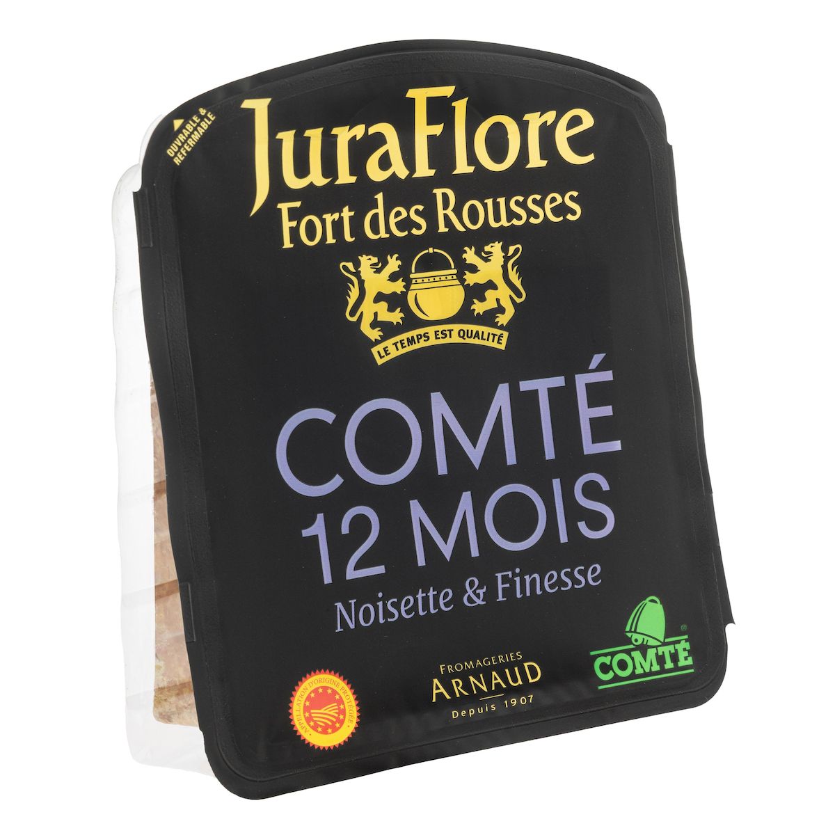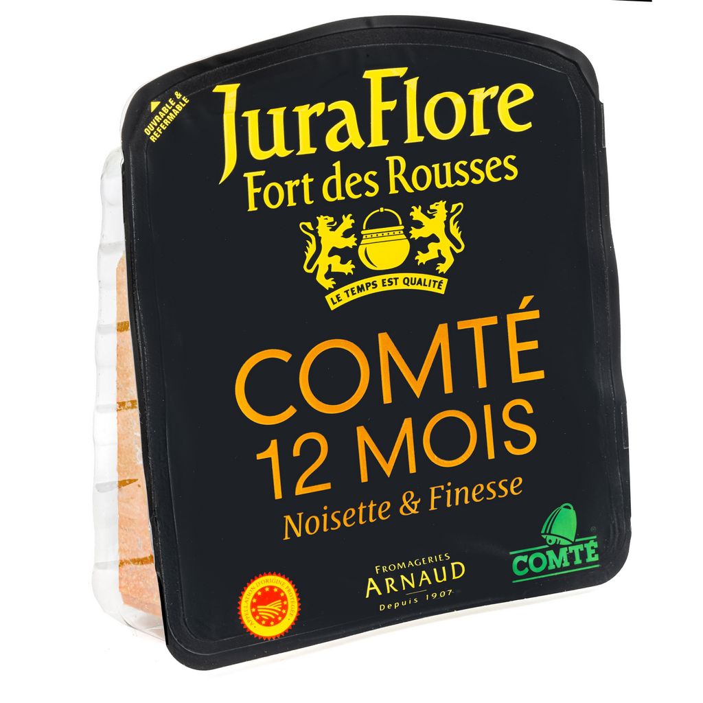 Les Comtés JURAFLORE Fort des Rousses affinés 12 mois sont fabriqués dans le strict respect de la tradition dans des petites fromageries en Franche-Comté appelées fruitières. Ils sont ensuite affinés dans les majestueuses Caves du Fort des Rousses sous la surveillance experte de nos Maîtres Affineurs. Les Comtés JURAFLORE sont régulièrement primés pour les qualités exceptionnelles et font ainsi partie des fromages les plus distingués de France.