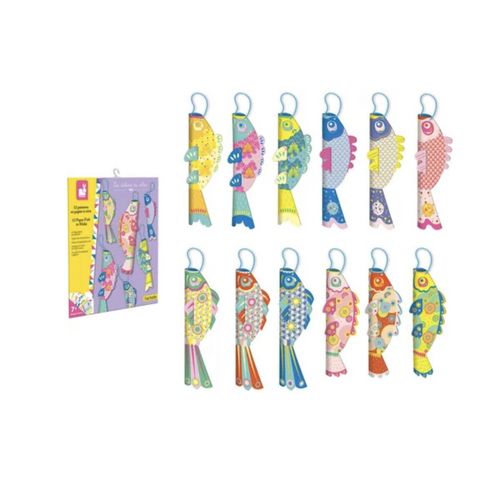 Farandole de poissons ! Cette pochette créative permet de réaliser 12 poissons en papier de 4 modèles différents à décorer de jolis stickers ! Elle contient 12 planches prédécoupées, 2 planches de stickers, du fil et 1 livret avec les instructions et les modèles. Cette activité permet de développer