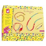 Quoi de mieux que de personnaliser ses bijoux avec de doux messages ? Une touche d'originalité qui permet de les rendre uniques, et fera son petit effet dans la cour de récré ! Ce joli coffret créatif accessible pour les enfants à partir de 6 ans, permet de réaliser une broche, deux bracelets et un collier personnalisé ! Il comprend de multiples perles (dont 300 perles heishi plates fines et 18 perles lettres), des fils de jade et autres accessoires permettant de réaliser ses créations, à l'aide du livret explicatif. Les perles lettres permettent de composer les mots Summer , Love , Star , et Happy à insérer dans le bijou de son choix. Une activité qui nécessite calme et concentration et permet de développer la dextérité. Elle sera idéale pour occuper les enfants par temps de pluie, ou encore pour partager de bons moments au cours d'une après-midi entre copines ou d'une soirée pyjama ! Une fois ses bijoux réalisés, votre enfant pourra évidemment les porter ou choisir de les offrir à maman ou à ses amies : un cadeau plein de tendresse ! Le petit plus de ce coffret ? Ce n'est pas un simple coffret, mais une adorable boîte à bijoux en carton solide composé de 4 casiers, qui pourront accueillir les nouvelles créations comme les autres bijoux de l'enfant ! Ce kit appartient à la collection Les Ateliers Bijoux développée en collaboration avec les éditions Hachette, spécialistes des contenus éducatifs et du loisir créatif pour enfants. Contient 300 perles heishi, 18 perles lettres, 1 perle c?ur, 3 perles dorées, 1 cori, 1 perle étoile, 1 fil nylon, 3 fils de jade, 1 support de broche, 1 mini-anneau, 1 fermoir, 2 perles à écraser dorées, 2 stoppeurs dorés, 1 livret d'instructions et de modèles. Matériau(x) utilisé(s) : Coton, Nylon, Métal, Plastique.