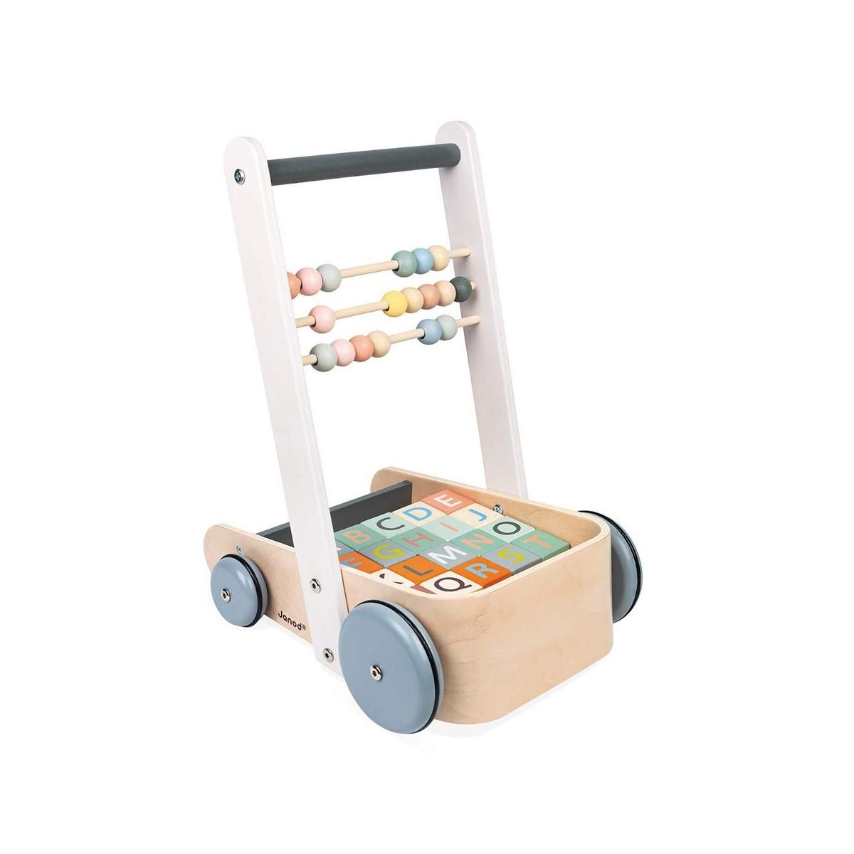 Votre bébé fera ses premiers pas avec le chariot ABC Buggy. Ce chariot d'éveil de la gamme Sweet cocoon est idéale pour les premiers pas de bébé. Pour encore plus de jeu, ce chariot est garni de jouets d'éveil. Avec ses 20 cubes illustrés, votre bébé peut jouer avec toutes les lettres de l'alphabet et les chiffres. Votre enfant apprend à compter et créé ses premiers mots. Une fois que votre petit a bien joué, il peut empiler tous ses cubes dans son chariot et se promener dans la maison. La gamme de jeu en bois Sweet Cocoon de Janod, accompagne les enfants dans leurs premiers apprentissages, tout en douceur. Peinture à l'eau. Bois : contreplaqué et merisier. Cubes imprimés recto/verso.