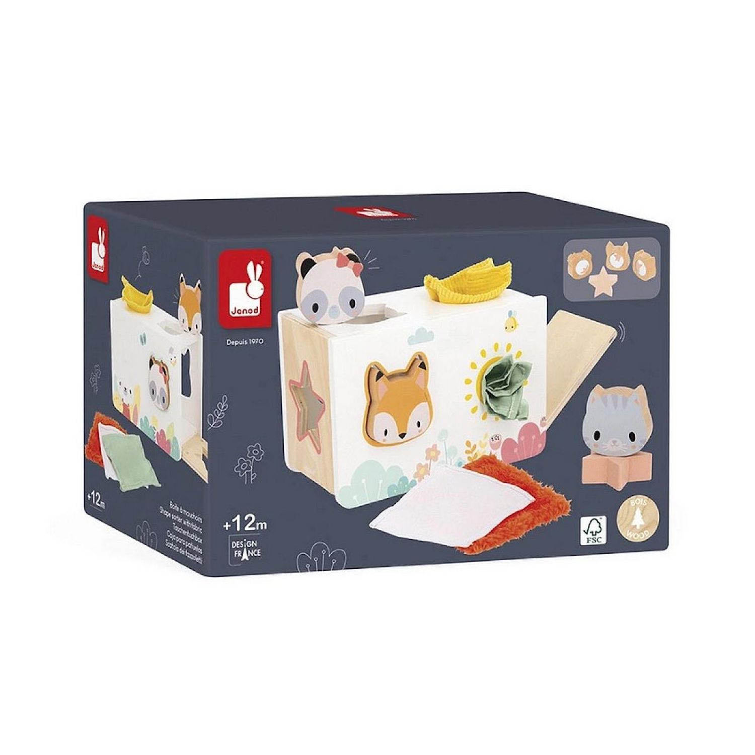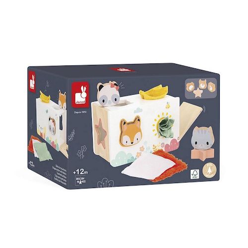 ? Boîte à formes et textures en bois. ? 4 mouchoirs aux textures variées à tirer, froisser et explorer. ? Des miroirs déformants derrière chaque tête pour amuser bébé. Place à la découverte avec cette jolie boîte à mouchoirs ! Les bébés dès 1 an s'éveillent en douceur grâce à cette boîte à formes et textures qui développe la motricité fine, le toucher et la vue. Avec ce jouet d'éveil, bébé observe, manipule et encastre les 4 pièces en bois dans les formes adaptées. On retrouve 1 étoile et 3 adorables têtes d'animaux : 1 panda, 1 chat et 1 renard. Trop rigolo, derrière chaque tête, il y a un miroir déformant qui fera bien rire les tous-petits ! Bébé glisse sa petite main dans la boîte? surprise ! Un mouchoir tout doux apparaît. Et là, un autre tout rugueux ! Chaque tissu est une nouvelle découverte à toucher, tirer, froisser. Bébé pourra y trouver 4 mouchoirs aux textures variées. De quoi satisfaire sa curiosité et son envie de tout explorer ! Trop pratique, les petites portes en bois sur les côtés s'ouvrent? et hop, bébé peut récupérer facilement les pièces qu'il a glissées dans la boîte. Un geste simple qui prolonge le jeu et encourage l'autonomie ! Ce jouet aux couleurs douces et aux illustrations délicates crée un univers rassurant et joyeux pour bébé. Issue de notre collection de jouets d'éveil en bois Pure, cette boîte à mouchoirs sensorielle est composée de bois certifié FSC?. Dimensions. 20,5 x 11 x 13,5 cm. Matière. Bois (contreplaqué)
