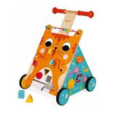 Chariot multi-activités à pousser avec poignée ajustable en hauteur (47 à 53cm) et frein invisible amovible. Chariot évolutif pour apprendre à marcher. 8 activités: looping, boite à formes, souris à glisser, descendeur, engrenage, bouton sonore, yeux. Tous les jouets Janod sont imaginés en France, dans le Jura.