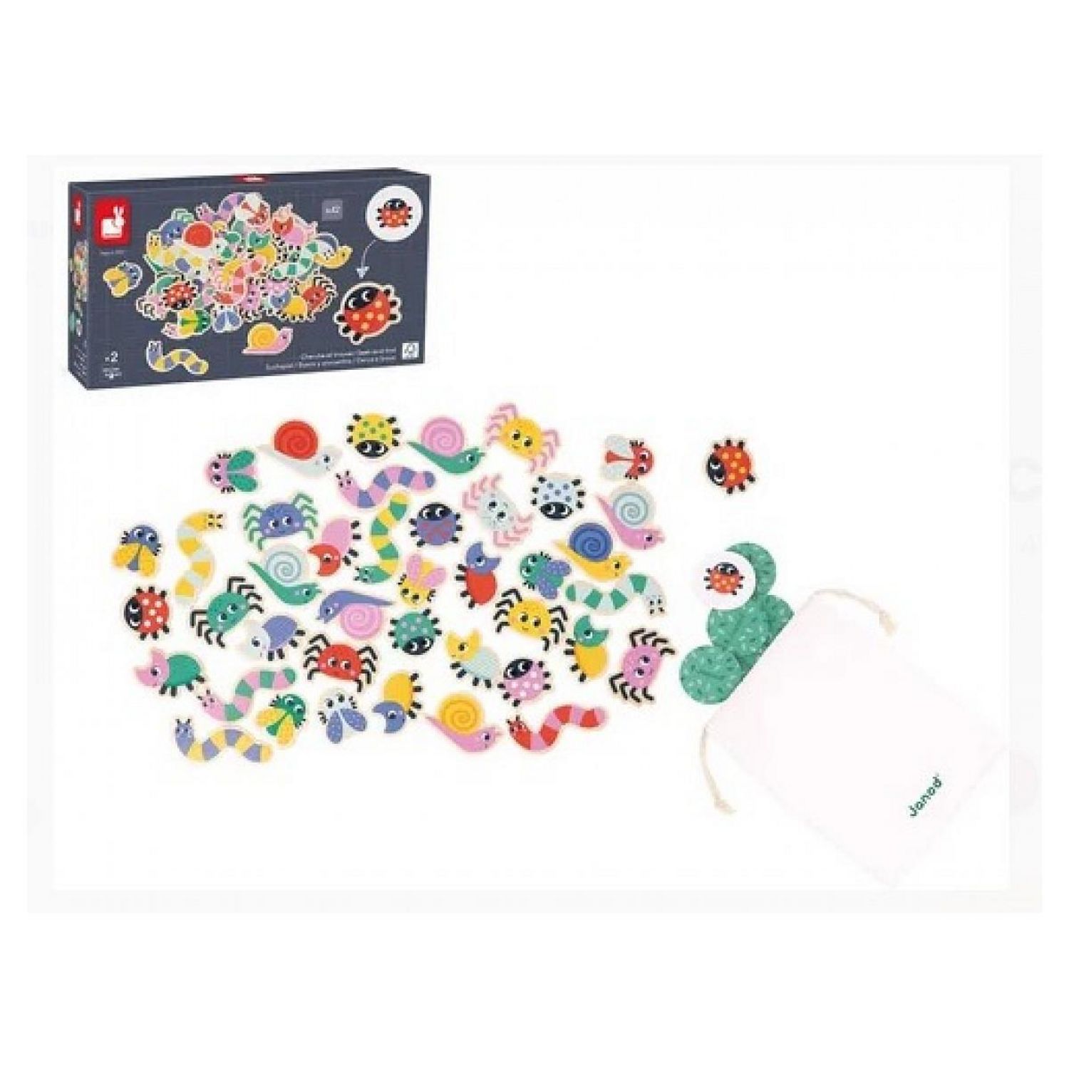 Où se cache l'escargot bleu et jaune ? Observez le jardin et tentez de retrouver les insectes et animaux colorés. Mais attention à ne pas les confondre entre eux ! Chacun possède ses propres caractéristiques : formes et couleurs. Ce jeu éducatif sous forme de Cherche et trouve permettra à votre enfant de développer son sens de l'observation. Il se compose de 7 chenilles, 7 coccinelles, 7 escargots, 7 scarabées, 7 araignées et 7 mouches en bois, ainsi que de 42 cartes en carton. L'objectif est de retrouver les animaux des cartes parmi 42 pièces en bois. Plusieurs modes de jeux sont disponibles : un atelier autonome et un atelier duo. Ils vous permettront d'accompagner votre enfant dans son apprentissage ou de le laisser retrouver les animaux du jeu en fonction des cartes. Ce jeu offre également la possibilité de jouer à plusieurs. Pour plus de praticité, un sac de rangement est fourni avec le jeu. Idéal pour l'emmener partout avec soi ! Jeu en bois et en carton FSCTM. Jeu éducatif développé en collaboration avec une professeure des écoles pour les enfants à partir de 2 ans.