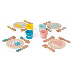 Cette dinette au style nordique complétera parfaitement une cuisine d'enfant ou à emmener en extérieur ou pour un pic pic La dinette permet d'aider l'enfant à intégrer le rituel du repas Il s'amusera à mettre la table, à organiser les emplacements de chacun des éléments 4 assiettes de 12 cm de diamètre, 4 verres, 4 grandes cuillères, 4 couteaux, 4 fourchettes. Les couverts sont épais. Les verres et les assiettes ne risqueront aucune casse.