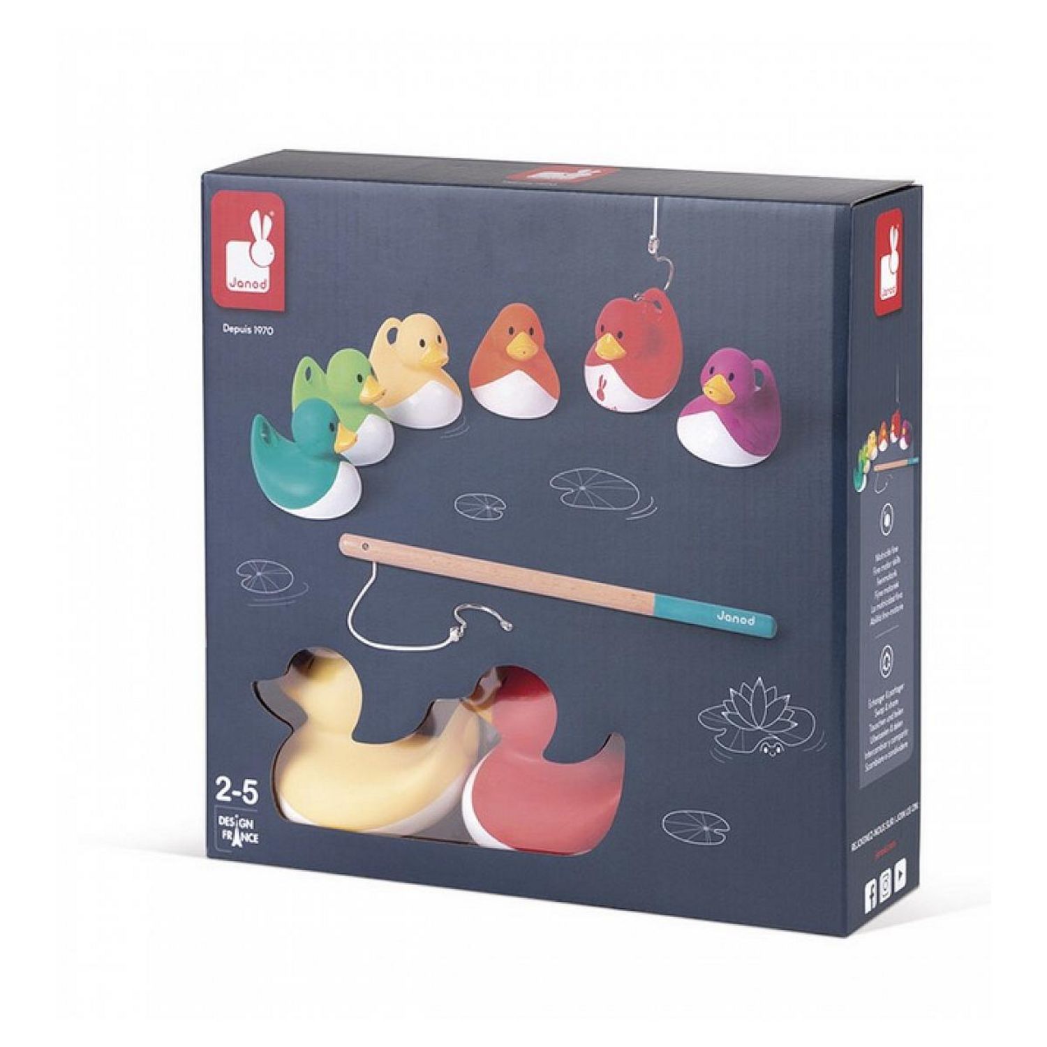 La pêche à la ligne Ducky par Janod met en scène des petits canards à pêcher à l'aide d'une canne à pêche. Caractéristiques techniques :. - Contient 2 cannes et 6 canards. - Matière : canard en plastique, canne en chêne massif, sacoche en PVC. - Dimensions des cannes : 30 x 1,5 cm. - Dimensions des