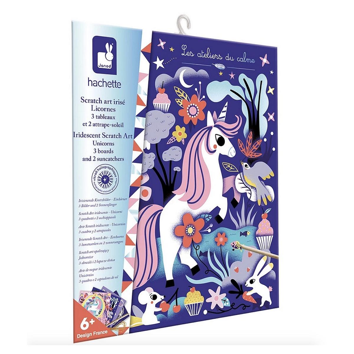 Avec ce kit créatif votre enfant réalise de belles décorations sur le thème des licornes pour ensuite les accrocher dans sa chambre. Grâce à la technique du Scratch Art, l'activité est accessible et amusante à réaliser pour les enfants dès 6 ans. Pour cela, rien de plus simple : il suffit de se munir du stylet en bois et de gratter les illustrations pré-tracées pour voir les licornes et les arcs-en-ciel se parer de couleurs éclatantes ! Le kit comprend 3 tableaux imprimés en couleurs, mais aussi deux attrape-soleil prédécoupés. Ces suspensions, conçues sur un support PET transparent, dévoilent des reflets irisés et holographiques au fur et à mesure que l'enfant gratte l'encre. Petit à petit, l'enfant découvre l'univers de ces créatures magiques : friandises, fleurs ou encore animaux de la forêt ! Une fois révélées, ces créations se suspendent facilement grâce au fil inclus, pour créer des objets décoratifs uniques. Waouh, ça brille ! Elles captent chaque rayon de soleil pour illuminer la chambre de votre enfant ! Une activité qui allie plaisir créatif, patience et émerveillement, pour des créations qui font briller les yeux des petits artistes ! Issu de la collection Les Ateliers du Calme , ce coffret contient : 5 tableaux à gratter de 21 x 25 cm (2 pour créer deux suspensions et 3 imprimés en 4 couleurs avec encre à gratter), du fil, 1 outil en bois et 1 livret explicatif.