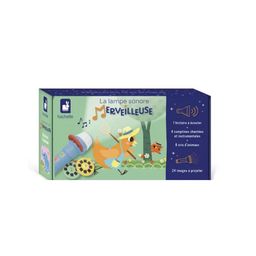 Envolez-vous pour la ferme ou la savane avec la Lampe Sonore Merveilleuse « Les Animaux », la lampe à histoires idéale pour les enfants dès 3 ans. Protagonistes incontournables des fables ou des comptines, nos amis les animaux sont à l'honneur ! Invitez votre bambin dans un univers magique et donnez vie aux récits avec cette chouette conteuse d'histoires ! Cette lampe rigolote est bien plus qu'une simple lampe de poche pour enfant. En effet, elle combine un projecteur d'images et une conteuse sonore, créant ainsi une expérience immersive pour les tout-petits. 9 minutes de son sont disponibles pour cela : une douce histoire de 4,5 minutes intitulée « La petite poule rousse », 4 comptines accompagnées de leurs versions instrumentales d'une durée de 3 minutes (« Ah ! Les crocodiles », « Une souris verte », « La famille tortue », « Une araignée sur le plancher ») et 8 sons thématiques enivrants de 71 secondes. Du rugissement du lion au cri chantant du perroquet, votre enfant s'évade alors dans le monde merveilleux des animaux. Notre lampe à histoires est livrée avec 3 rondelles correspondant chacune aux 3 boutons de la lampe et contenant 8 images, ainsi qu'un pochon de rangement. Alimentée par 2 piles AAA (non incluses), notre lampe sonore merveilleuse est prête à éclairer les rêves de votre tout-petit. Son design malin ne s'arrête pas là ! La lampe est livrée avec un pochon de rangement en coton. Les Animaux, conçue en collaboration avec la maison d'édition Hachette. Dimensions 16,5 x 4,5 x 4,5 cm. Matière Plastique, coton, papier